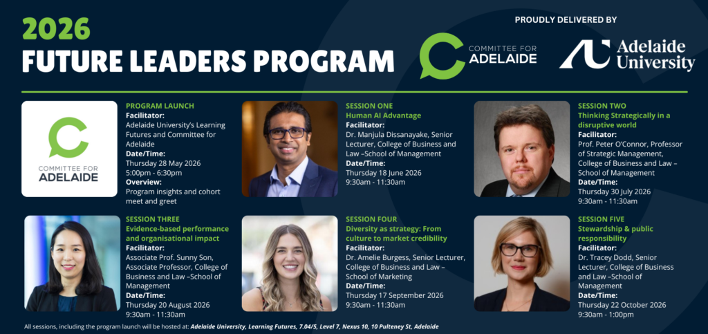 Building on our previous Emerging Leaders Program and aligning with the Committee’s focus on shaping the future of Adelaide, South Australia, the Future Leaders Program has been designed to equip future leaders across our Platinum Members with the knowledge and skills to navigate and lead in an unpredictable and rapidly changing environment.